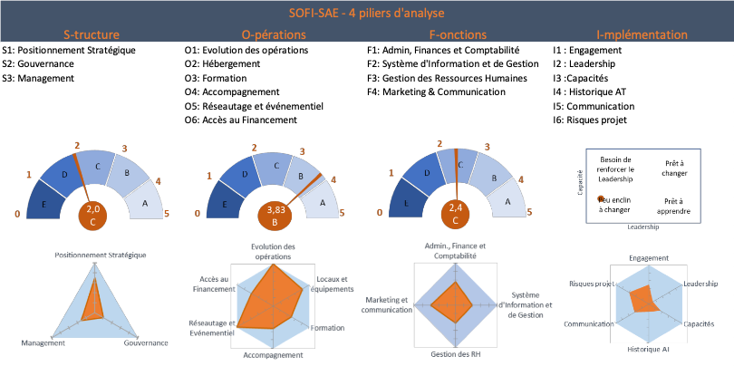 Basé sur 78 points de contrôle, Diagnostic SOFI-SAE permet aux SAE de disposer d’un état des lieux exhaustif de leur organisation, leurs performances opérationnelles, financières et sociales, la qualité de leurs RH et leur aptitude à développer leurs opérations. Il permet aux incubateurs de démarcher des partenaires et démontrer leurs besoins d’accompagnement en AT.